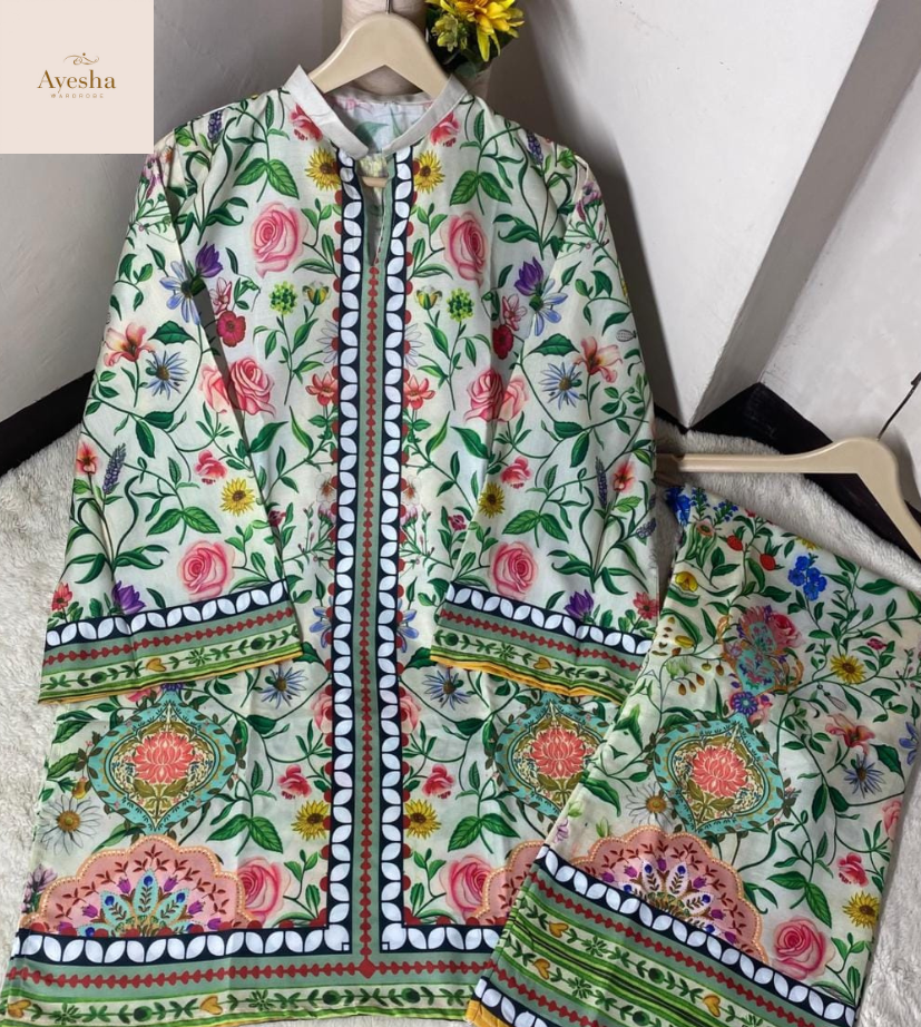 This Digital Printed Cord Set is the perfect blend of comfort and style. Crafted from premium Swiss Lawn fabric, it offers a soft, breathable, and lightweight feel ideal for everyday wear. The vibrant digital prints add a touch of elegance and charm, making it suitDigital Printed Cord Set made from premium Swiss Lawn fabric soft, breathable, and lightweight. Features vibrant prints with a 21/22″ chest, 35/36″ shirt length, and 38/39″ flyper length. Perfect blend of comfort and style for any occasion.able for both casual and semi-formal occasions. The shirt features a chest size of 21/22 inches with a length of 35/36 inches, paired with a flyper length of 38/39 inches for a perfect fit. A stylish and comfortable outfit that brings effortless grace to your wardrobe.