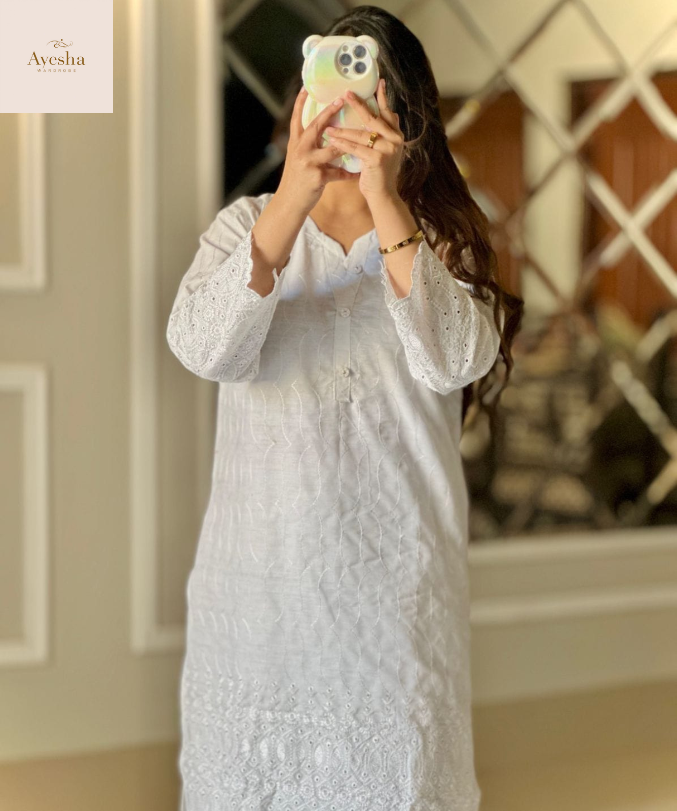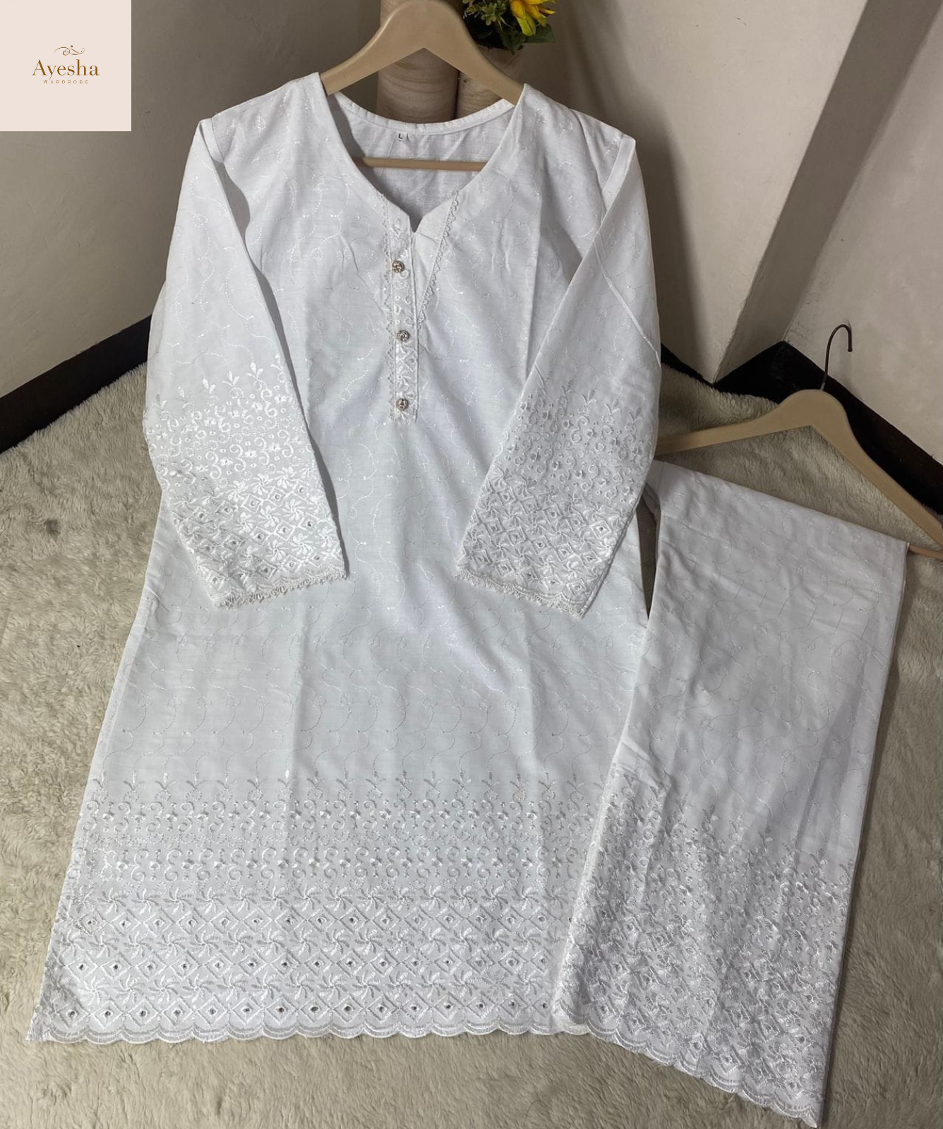 Elegant 2-piece cotton suit with full Chicken Kari embroidery, soft, breathable, and perfect for both casual and semi-formal wear.