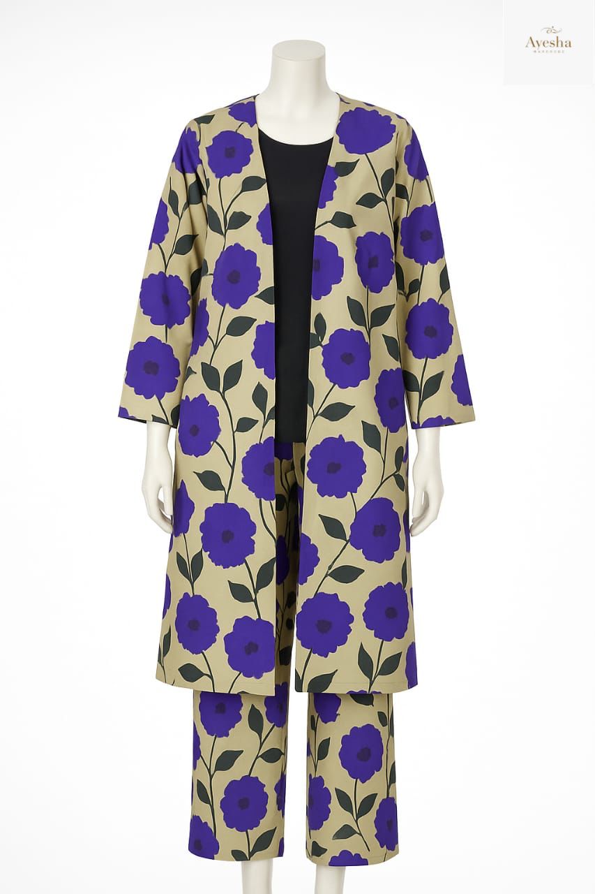Experience effortless summer comfort with this elegant Printed Floral Design Suit Set, crafted from soft and breathable Swiss Lawn fabric. The outfit includes a front-open style gown, matching trousers, and a premium silk inner, making it ideal for warm weather and casual day-to-day wear.