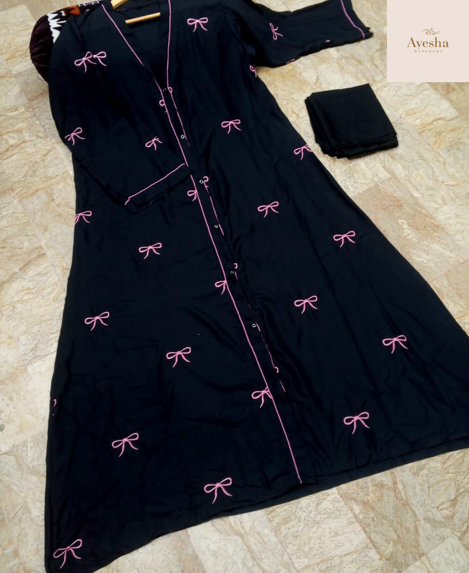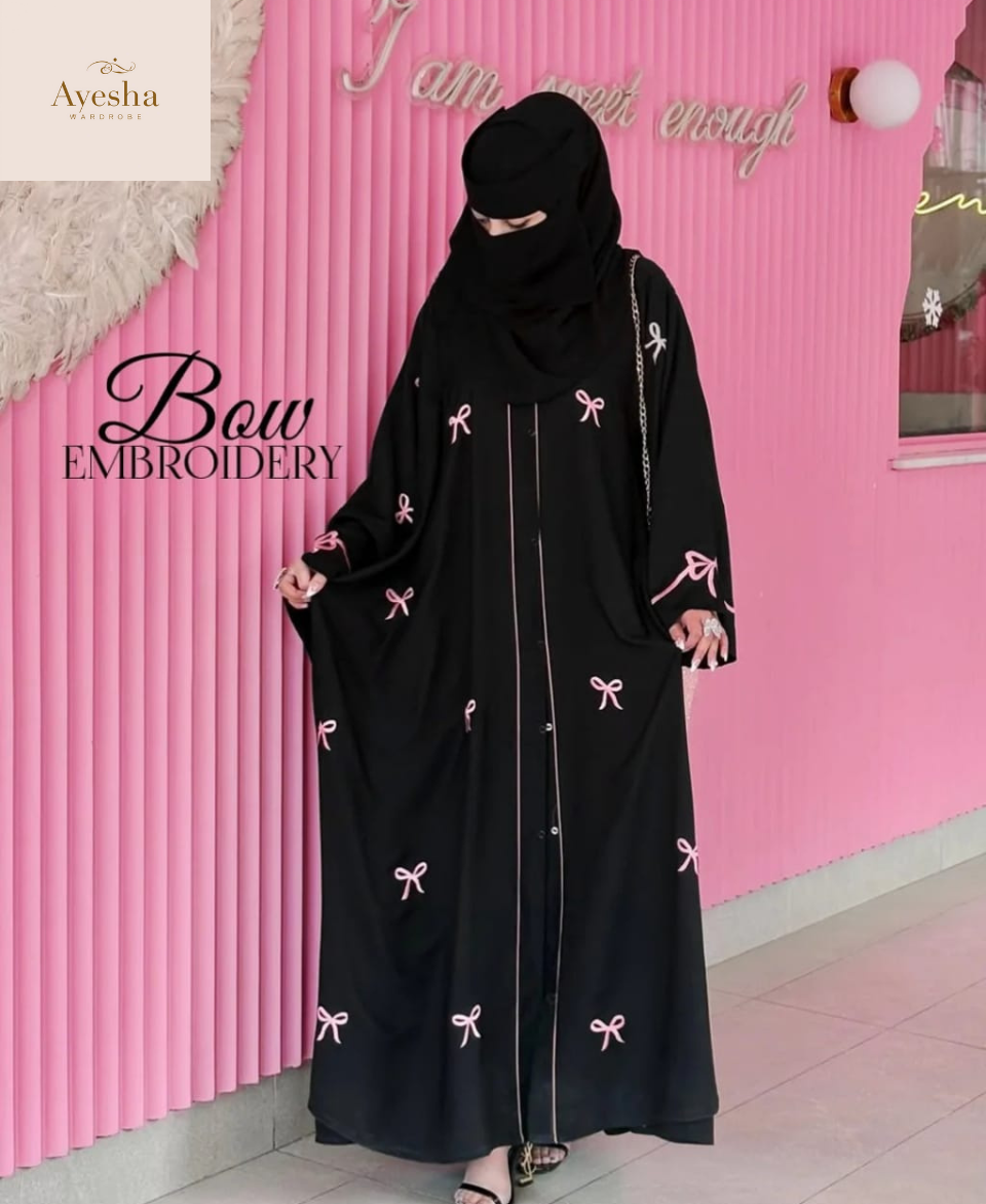 Trendy Bow Abaya with Stoller crafted from premium Georgette with embroidery, piping, and tich button detailing. Elegant, lightweight, and perfect for any occasion.