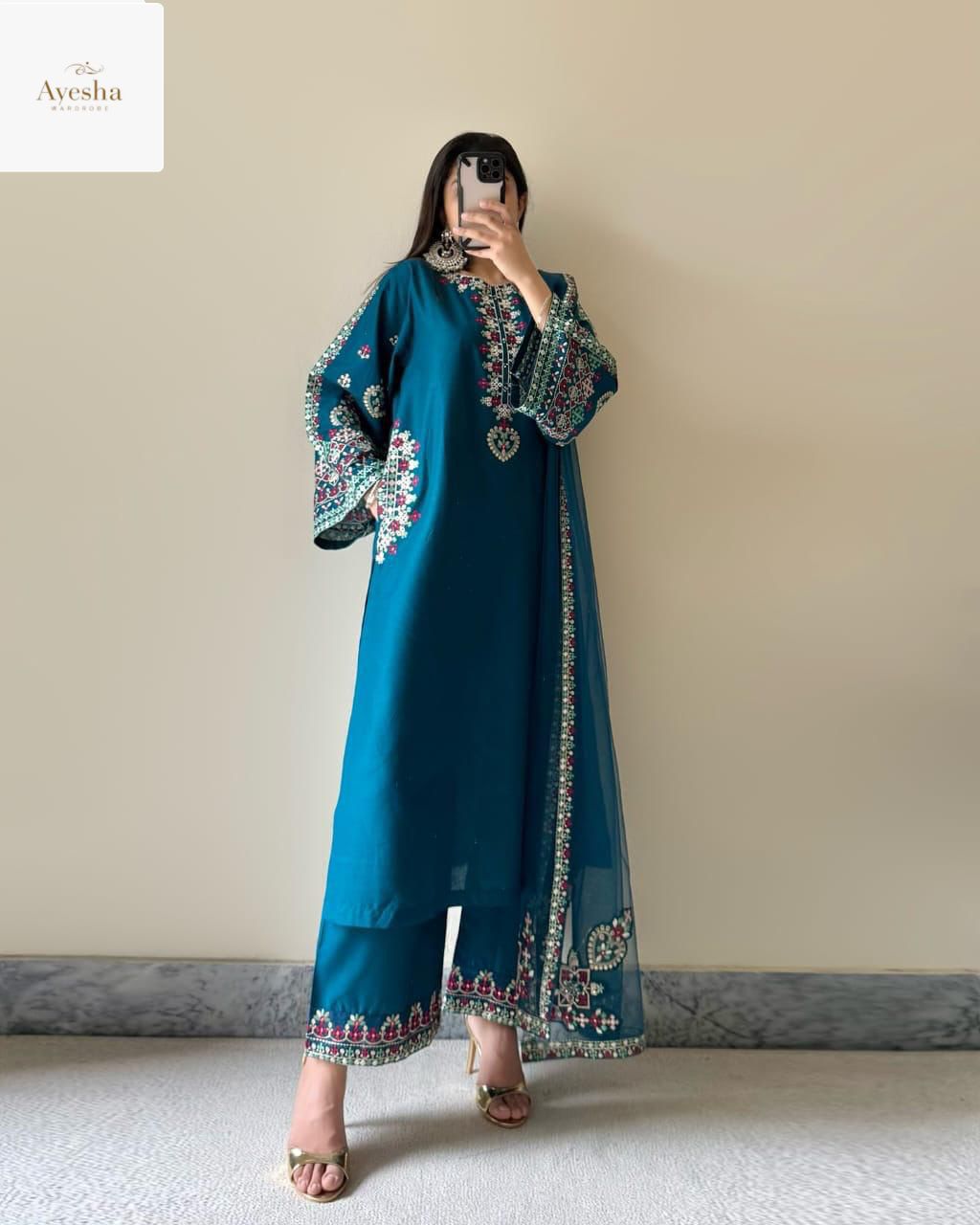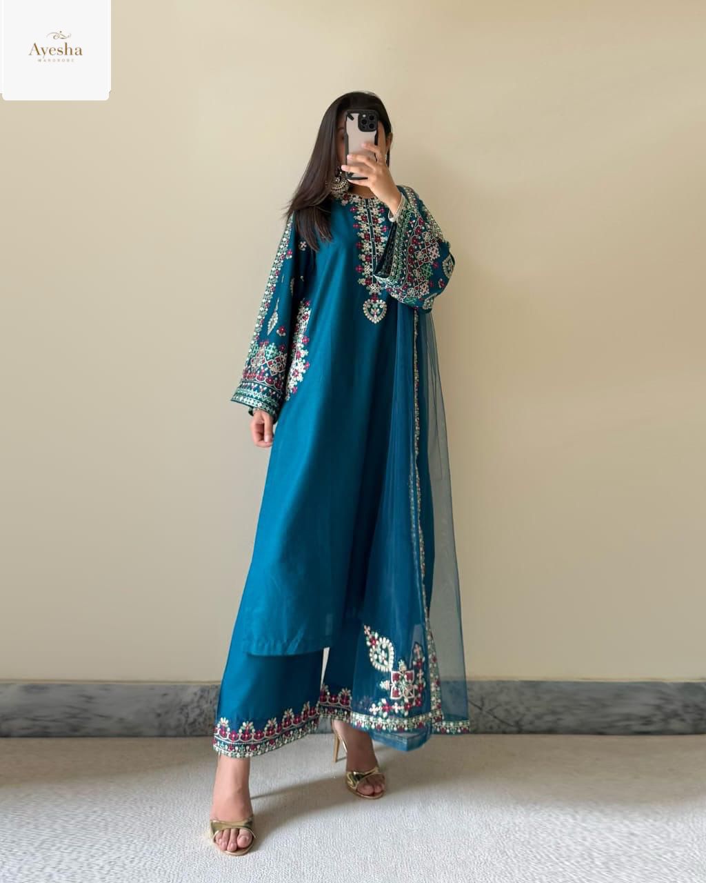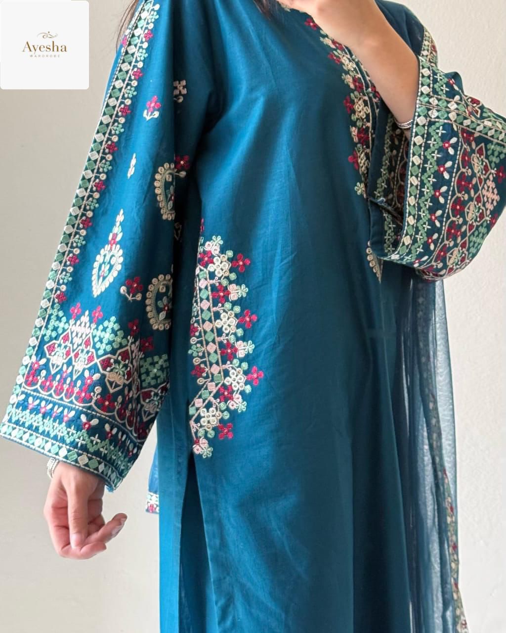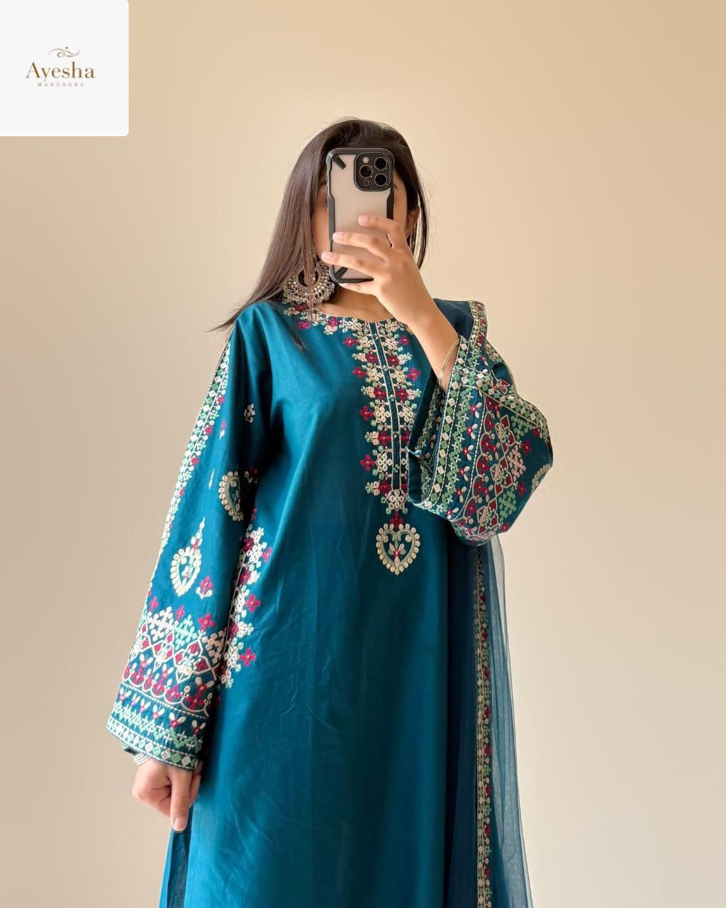 Elevate your style with the Zinc Teal Elegance 3PCS Set, a stunning ensemble that blends sophistication with contemporary charm. Made from luxurious Raw Silk, this outfit ensures a rich texture and graceful fall. The organza dupatta adds a touch of ethereal beauty, completing the look with sheer elegance.